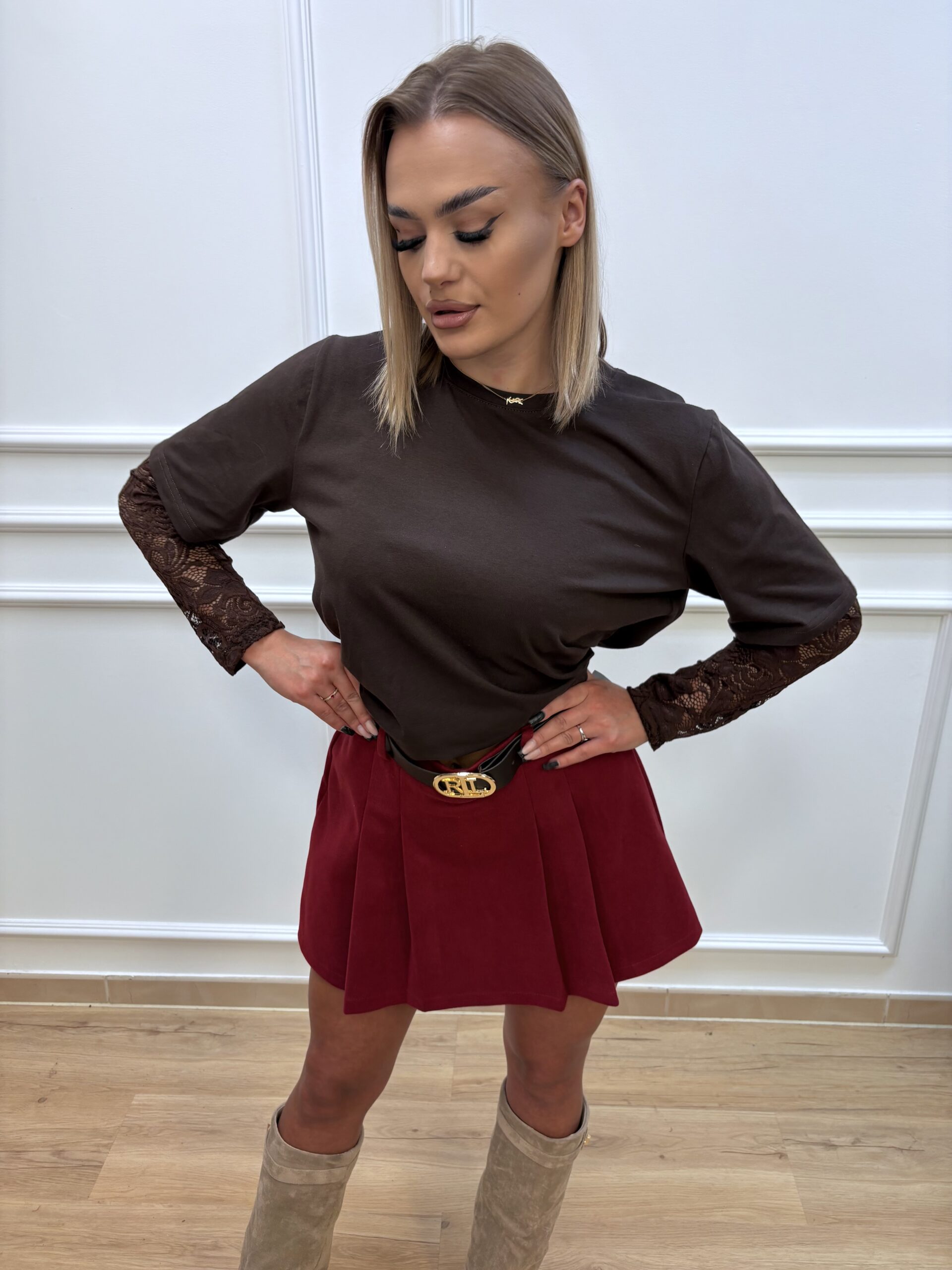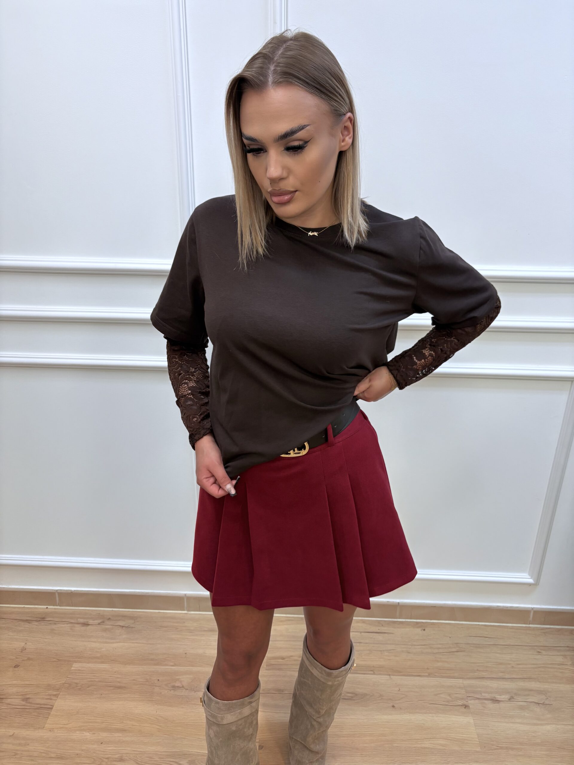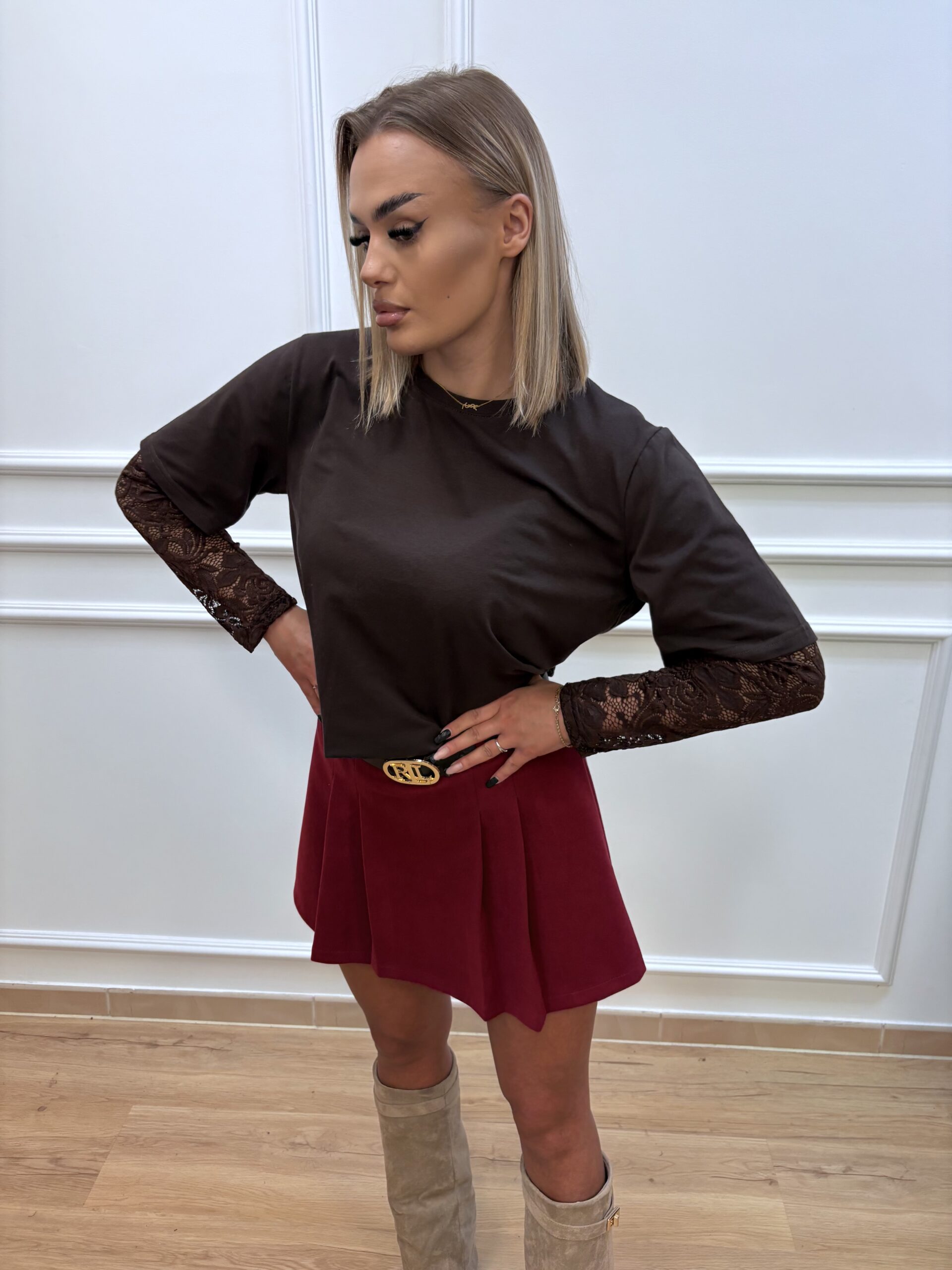 T-shirt z koronkowymi rękawami- brązowy