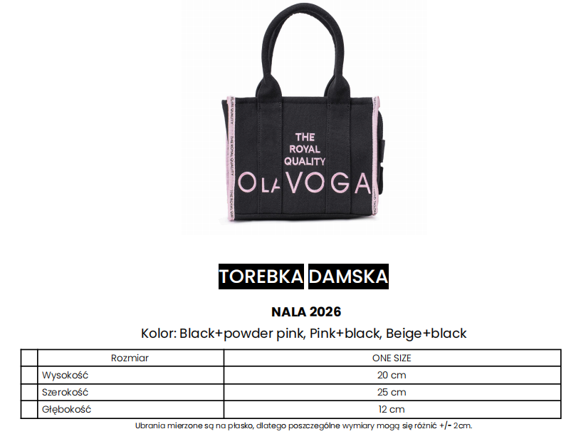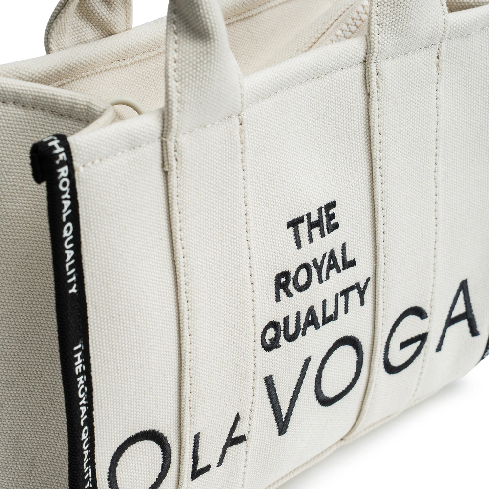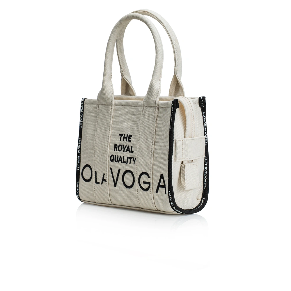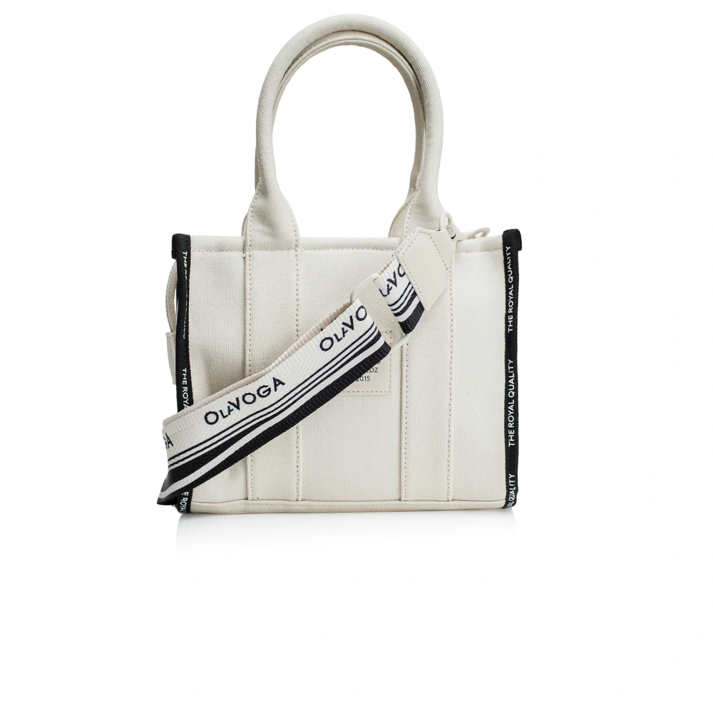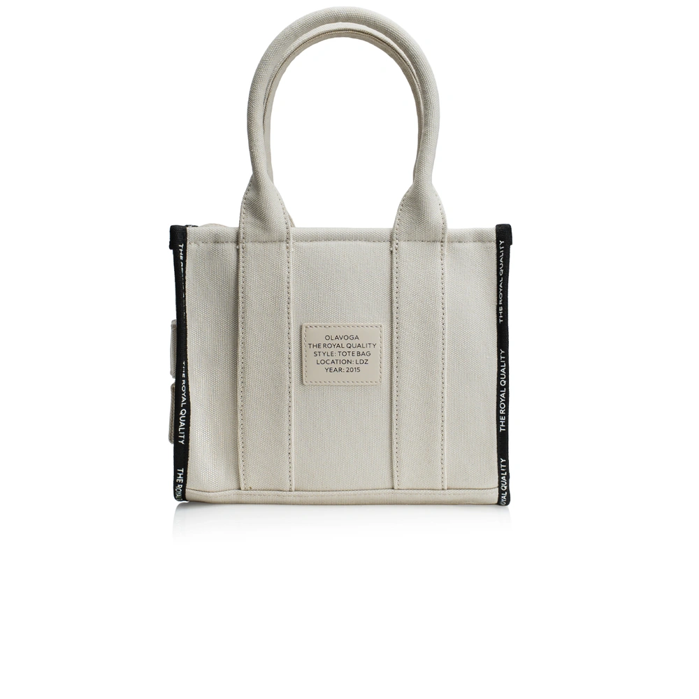 Mini torebka typu shopper o nowoczesnym designie. Wykonana z solidnego, tekstylnego materiału, ozdobiona wyrazistym logo OLAVOGA oraz kontrastowymi taśmami z nadrukiem THE ROYAL QUALITY. Posiada krótkie uchwyty do noszenia w dłoni, praktyczne zapięcie na zamek i wewnętrzną kieszonkę.