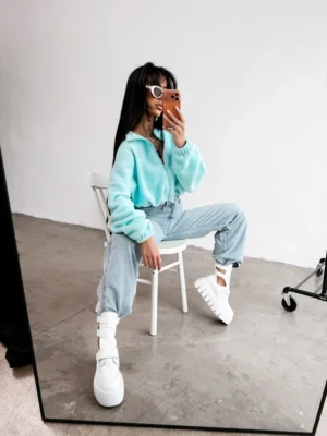Casualowa, rozpinana bluza o krótszym kroju. Wykonana z wysokiej jakości, miękkiego i przyjemnego w dotyku materiału. Model z podwyższonym kołnierzykiem. Długie rękawy zakończone elastycznymi ściągaczami oraz subtelnie marszczony dół. Na przodzie minimalistyczny haft z logo marki OLAVOGA, a na plecach efektowny, duży haft z logo brandu.