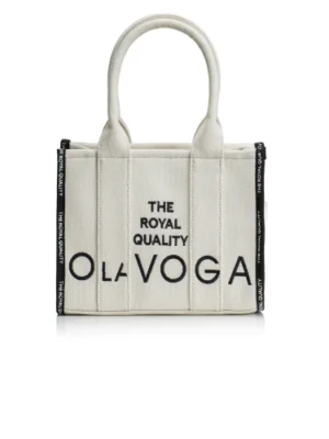 Mini torebka typu shopper o nowoczesnym designie. Wykonana z solidnego, tekstylnego materiału, ozdobiona wyrazistym logo OLAVOGA oraz kontrastowymi taśmami z nadrukiem THE ROYAL QUALITY. Posiada krótkie uchwyty do noszenia w dłoni, praktyczne zapięcie na zamek i wewnętrzną kieszonkę.